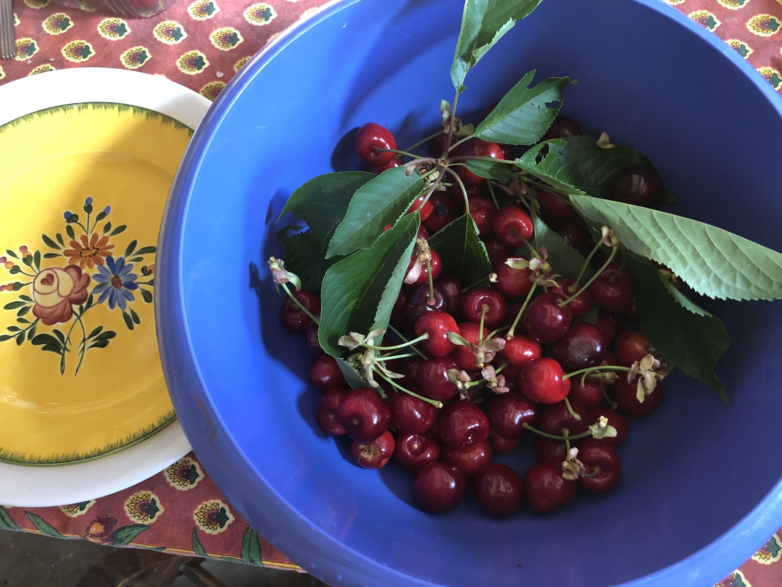 No need to buy cherries this morning, as Kathy and Ron have their own happy cherry trees in their “petite jardin.” When it is cherry season, you enjoy them fresh, but also make a Cherry Clafoutis.
