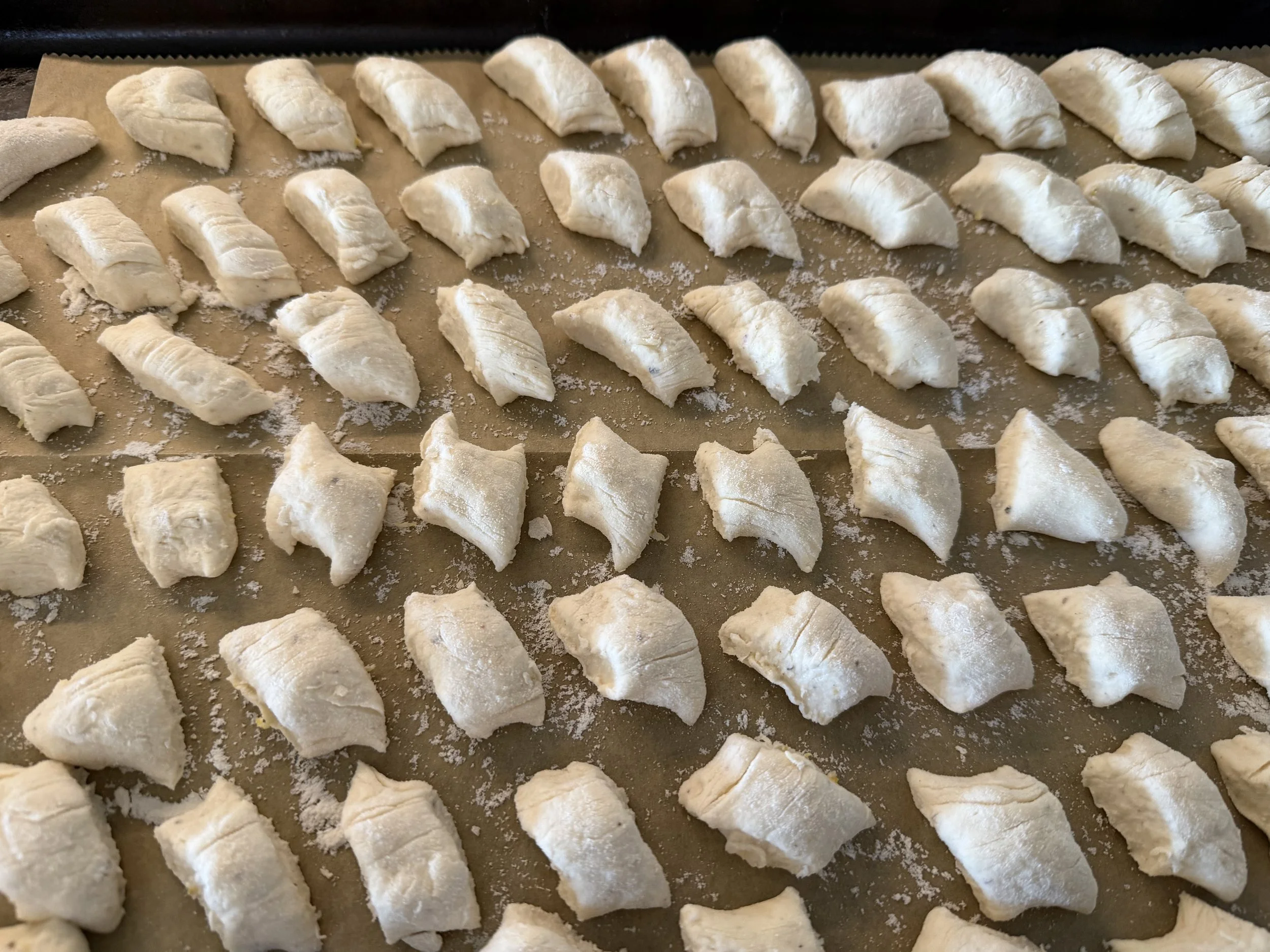 This is a great recipe to make this winter and around the holidays with your household guests, children, grandchildren, family, friends, and neighbors. Perfect for a project during cabin time in the mountains, all the christmas cookies are done, or making ahead a meal for the holidays, or just something fun to do together. If you enlist a group, why not make double or triple the dough recipe, and freeze it for later. Frozen gnocchi can be kept in the freezer up to two weeks.